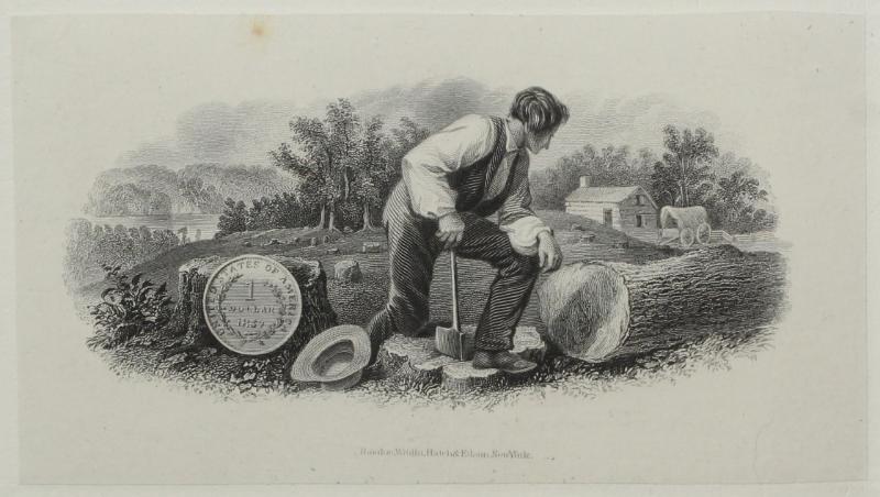 Sunken die engraved proof, possibly used for obsolete note, stock or check, shows 1850 $1 gold coin, farmer w/ axe & felled tree, homestead in background; Rawdon, Wright, Hatch & Edson, New York at bottom, marking on back indicates American Bank Note Co. archives; evidence of prior mounting on reverse, minor foxing, VF (Image)
