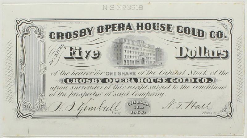 Sunken die engraved proof from the Western Bank Note and Engraving Co, Chicago, $5 one share in the Crosby Opera House Gold Co. dated 1866, five years before the building shown was destroyed in the Great Chicago Fire; XF (Image)