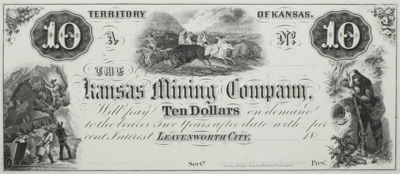 Die proof of $10 note from The Kansas Mining Company at Leavenworth City, Territory of Kansas, engravings of Indians hunting buffalo, miners and frontiersman with rifle, from American Bank Note Co. archives, VF (Image)