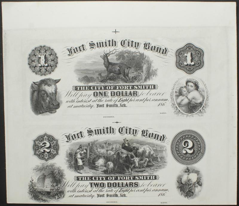 Engraved proofs of Fort Smith (Arkansas) City 8% Bonds, $1 and $2 pair, separate $3 note, cut from larger proof sheet, no printer given, great images of livestock, cotton, bee hives, etc; from American Bank Note Co. archive; VF (Image)