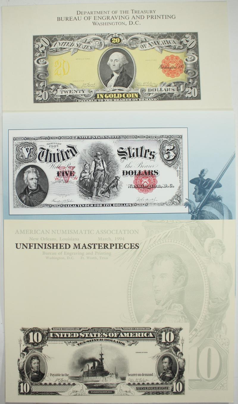 Stash of (82) Numismatic show cards, produced by the Bureau of Engraving and Printing for various coin or paper money shows; incl better 1969 Fresno Numismatic Society "City of Washington" print (Brookman CV $200); others mostly ANA, FUN or International Paper Money Show cards, plus a few other shows, 1969-2003 w/ wide variety of attractive engraved designs; some in original envelopes, gen VF (Image)