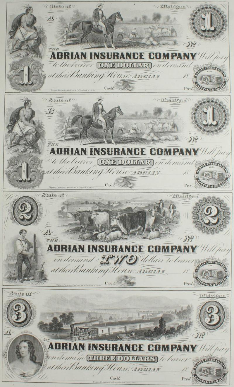 Engraved proof for strip of four notes from The Adrian Insurance Company (Michigan), $1, $1, $2 and $3 incl scenes of farming, cattle and railroad; company seal at LR has dog with key guarding lockbox; printer Toppan, Carpenter, Casilear & Co, New York & Phila. VF (Image)