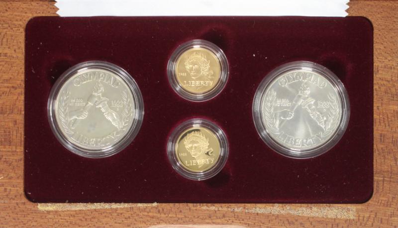 Olympic 1988 4-Coin Set incl Unc and Proof of the $1 and $5 Gold. All in OGP w/ box and papers. (.484 ozt AGW) (Image)
