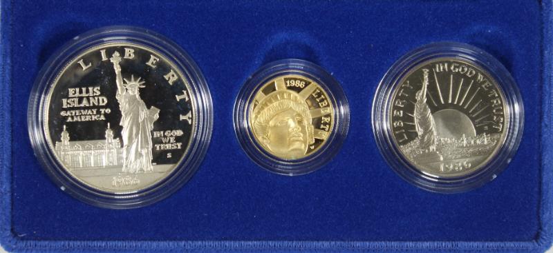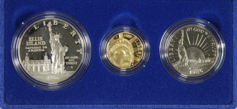 Statue of Liberty (Ellis Is) 1986 3-coin Proof Set in OGP w/ box and papers. ($5 Gold is .2419 ozt AGW) (Image)