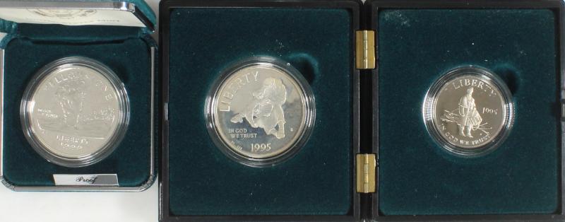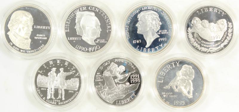 (7) Diff Proof $1 blast white in capsule but lacking outer boxes. Incl Ike (1990), Mt Rushmore (1991), Madison (1993), Jefferson (1993), Civil War (1995), WW II (1995), & Lewis & Clark (2004). (Image)
