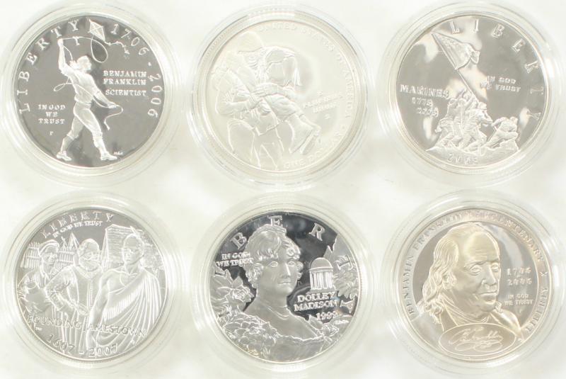(6) Diff Proof $1 (there is one Unc) blast white in capsule but lacking outer boxes. Incl Dolley Madison (1999), Marine Corps (2005), Franklin Scientist (2006), Franklin Founding Father (2006), Medal of Honor (unc) (2011), & Jamestown (2007). (Image)
