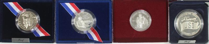 Selection (12) different PROOF Commemoratives in small US Mint packaging; 50¢ clad 1986 Statue of Liberty, 1993 WWII, 2014 Baseball (no paper); 50¢ silver 1982 GW, 1993 Bill of Rights; $1 silver 1991 USO (no paper), 2007 Jamestown (no paper), 2009 Lincoln, 2010 Boy Scouts, 2016 National Parks, 2019 Apollo 11, 2021 McAuliffe (June Greysheet $359.06) (Image)