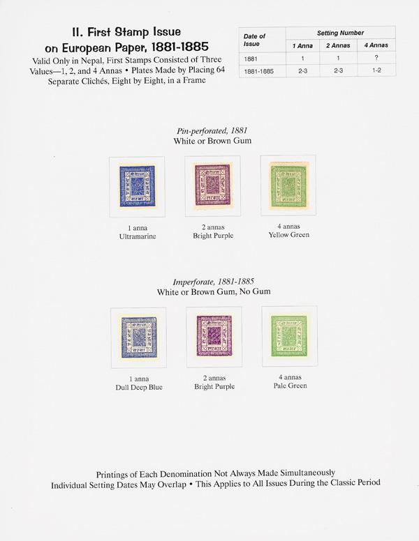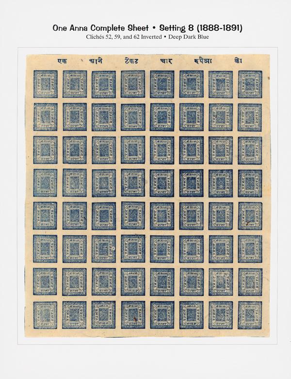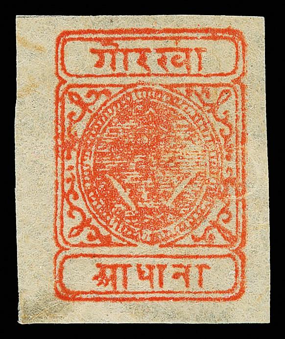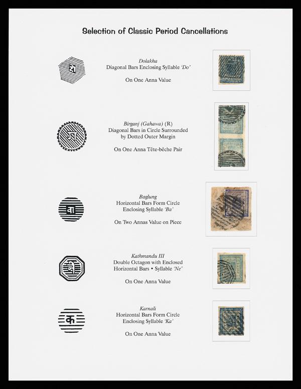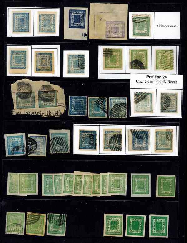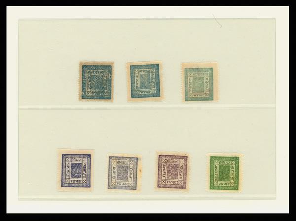 First Issue Mainly Unused Specialized Collection, 1881 (Scott 1-6), replete with shades, impressions, and plate varieties, as well as 1a cancellations, presented to the highest standard, comprising pin-perforated 1a unused (5, one Setting 1, position 4 with fancy sheet imprint and border), 2a (5), 4a (2), and imperforate 1a (14), 2a (7), 4a (7), also interesting cancellations on 1a (10) and superb 8a tied by complete "Kathmandu 1" on piece; a few small faults, mainly Fine to Very Fine, fully imaged online. (PDF for this Lot) (Image)