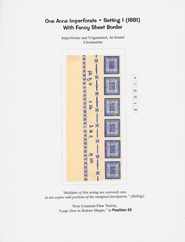 1881, Crown and Khukris, European wove paper, imperforate, 1a deep ultramarine, Setting 1 (Scott 4), left margin vertical strip of 6, with spectacular 64mm sheet margin showing complete ornaments and inscriptions; remarkably rich color on crisp white paper, position 25 with constant plate variety "large dent in bottom margin", without gum as issued; two neat vertical creases between 3rd and 4th rows, Very Fine, an exquisite positional piece of the highest exhibition caliber.
