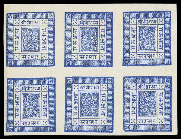 1881, Crown and Khukris, European wove paper, imperforate, 1a bright ultramarine, Setting 1 (Scott 4), block of six [4-5-6/12-13-14], position [12] is the short cliché and [14] has rounded lower left corner; bright fresh color, without gum as issued; light horizontal bend across top row of stamps, Fine to Very Fine, with 1978 R.P.S.L. certificate. (Image)