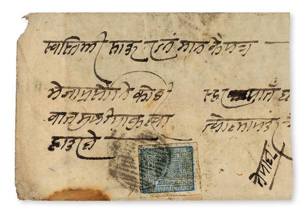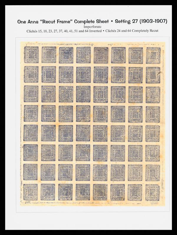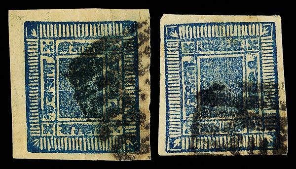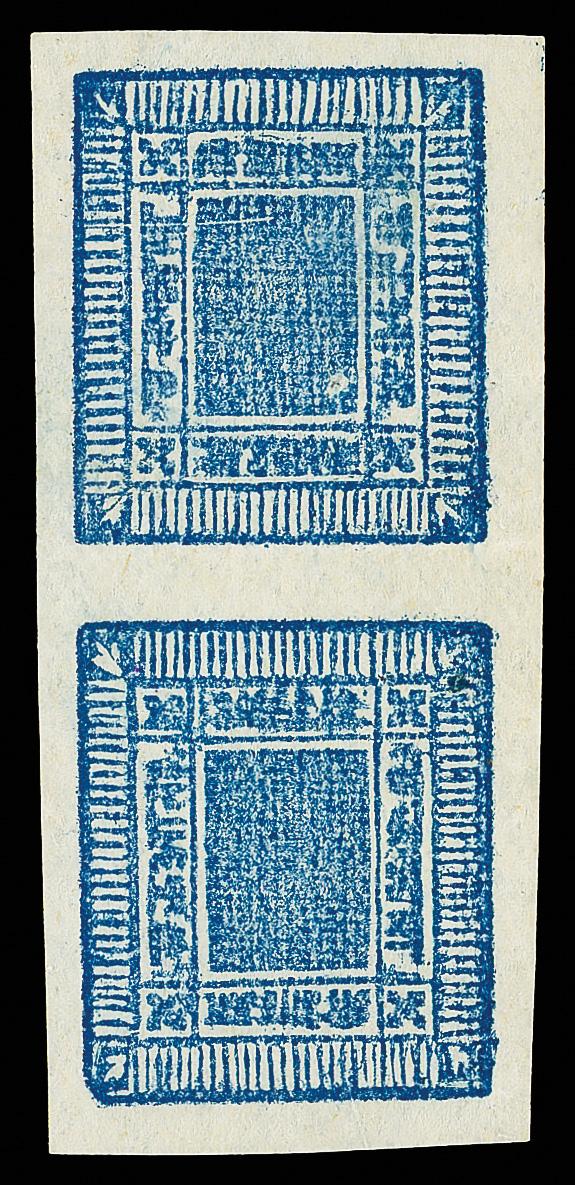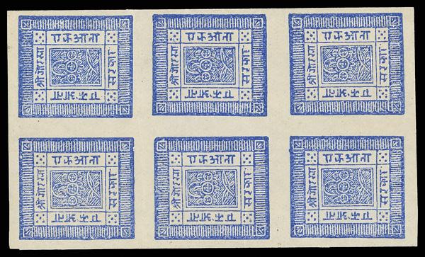 1901, Crown and Khukris, recut, native wove paper, imperforate, 1a blue or ultramarine, impressive study (Scott 23, 23a), pair, unused and used with a wealth of shades, impressions, multiples, plate varieties, and cancellations, including Setting 26, 1a deep blue on European wove paper used, and Setting 27, First State, various tête-bêche pairs and multiples unused, with 1a deep gray-blue block of nine with position 37, 1a deep blue block of four from the top right corner of the sheet containing position 15, 1a slate blue vertical strip of eight from the left of the sheet representing the first row with cliché 41 inverted, unused (reattached across middle row of stamps),1a horizontal strips of three (2) canceled at Dhankuta and Jhapa, 1a vertical strip of four with middle stamps yielding two tête-bêche pairs canceled at Jhapa, and 1903-09 covers (2) bearing major plate flaws, position 40 "dented corner" on 1903 envelope from Birganj to Kathmandu, and position 64 "broken lower left corner" on 1909 cover from Kadarban to Kathmandu, without gum as issued, Fine to Very Fine. (Image)
