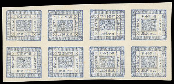 1881, Crown and Khukris, European wove paper, imperforate, 1a milky blue, Setting 3 (Scott 4), block of eight [39-40/47-48/55-56/63-64], position 39 has dented lower right corner, position 40 has dented top right corner, position 48 shows the major printing flaw split cliché (vertical break in top right frame), and position 63 has dented left corner; characteristic pastel-like shade and impression, without gum as issued, Very Fine, a remarkable group of plate varieties se-tenant in this appealing multiple. (Image)