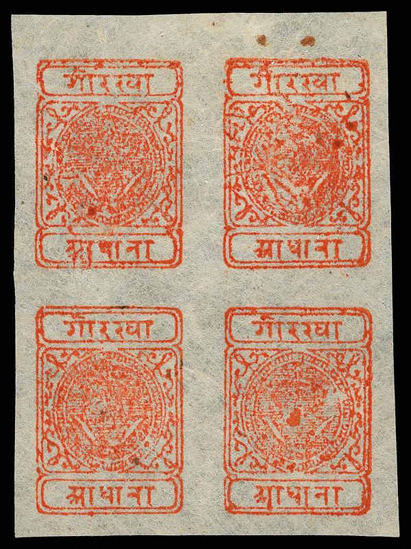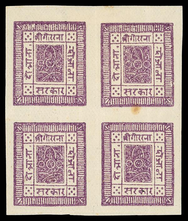 1917, Siva's Bow and Khukris, ½a orange vermilion, imperforate (Scott 11), stunning block of four from the top of the sheet, positions [3-4/11-12], clear impression, deep bright color on fresh white paper, large to enormous margins, without gum as issued, Extremely Fine gem, with 1984 Hellrigl certificate that describes the block as "absolutely faultless and in extra fine condition". (Image)