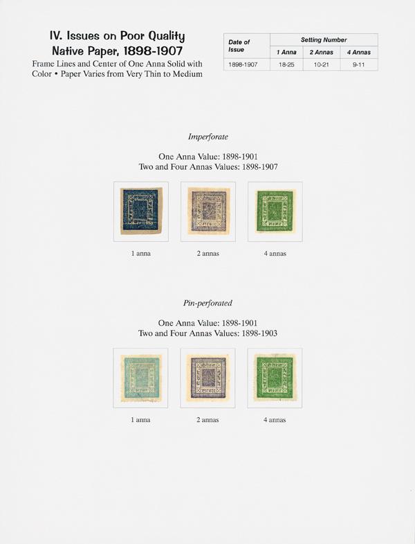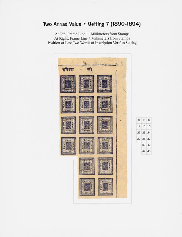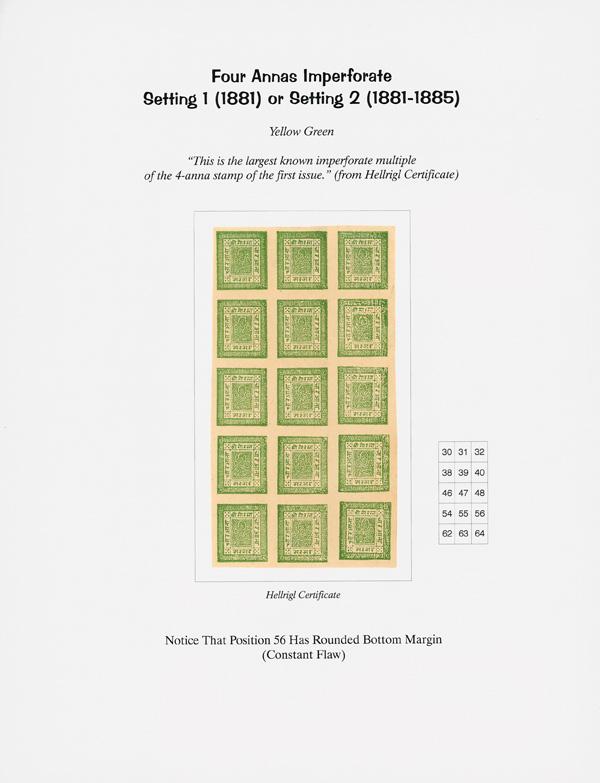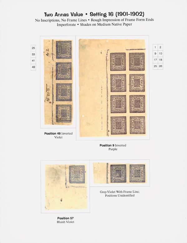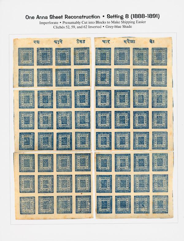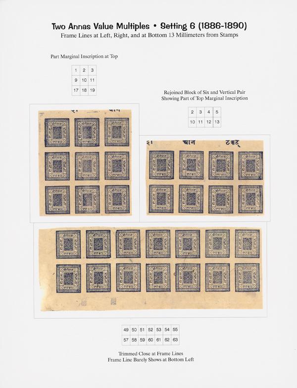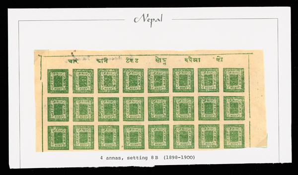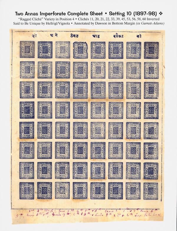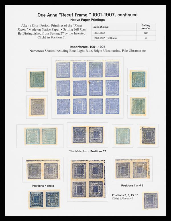 1899, Siva's Bow and Khukris, ½a black, imperforate, unused study (Scott 10), with plate varieties and multiples, including 1899-1900, Setting 1, sub-setting B, corner blocks of eight and four, and marginal block of four, thick paper fine prints representing the top two rows of the sheet with marginal frame lines, "whitened" by chemical alteration (1985 Hellrigl certificate), 1903-05, Setting 3, pin-perf, block of 32 from the right of the sheet, and partly pin-perf (top two rows) block of 15 from the top left corner of the sheet, Setting 3, from the right of the sheet, positions [6-7-8/14-15-16], cliché 6 "flattened base" and cliché 7 inverted (unique to this Setting), and pin-perf block of eight, Setting 5 (?), positions [49-50-51-52/57-58-59-60], without gum as issued, mainly Very Fine. (Image)