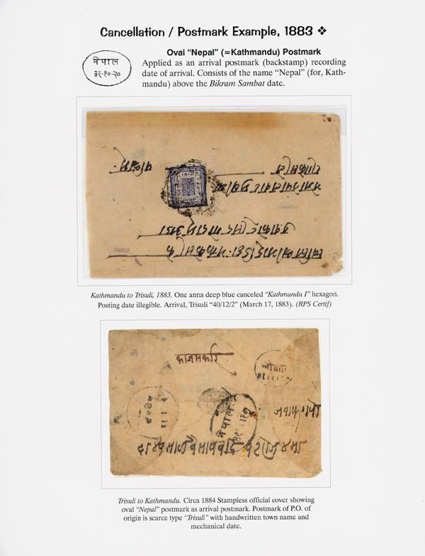 1883 (Mar.), Cover from Kathmandu to Trisuli bearing imperforate 1a ultramarine (Scott 4), good to close margins, canceled by "Kathmandu 1" hexagonal handstamp, lower right corner of cover a trifle worn; plus ca. 1884 unfranked Official cover from Trisuli to Kathmandu, showing Trisuli origin datestamp with handwritten town name and mechanical date, and "Nepal" oval arrival datestamp, Fine. (Image)