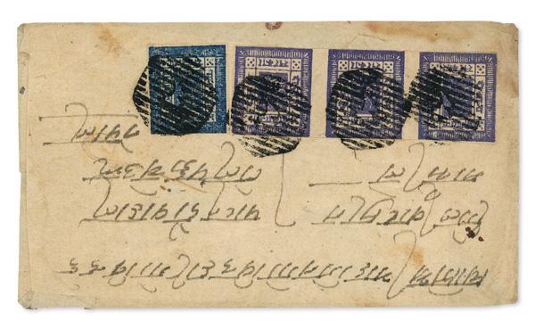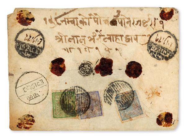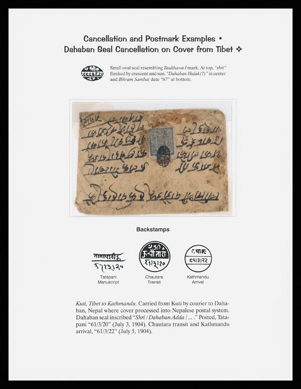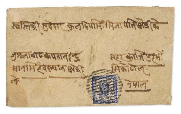 1904 (July), Cover from Kuti, Tibet to Kathmandu (7.5), carried by courier from Kuti to Dahaban, where processed into the Nepal postal system, bearing recut frame 1a grayish blue, canceled by small Dahaban negative seal reading "Shri/Dahaban Adda/Bikram Sambat 67", posted at Tatapani on July 3 (manuscript), with "Chautara" transit and "Kathmandu" arrival c.d.s. on reverse (faults); stamp barely touched in one corner, Fine to Very Fine, rare and interesting use.(Image)