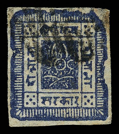 1884 (June 7), Cover from Jumla to Kathmandu (6.13) bearing imperforate 1a ultramarine (Scott 4), large margins at sides, close to clear irregular margins at top and foot, superbly canceled by Jumla circular barred handstamp; cover a little reduced at right, Fine to Very Fine, with 1978 R.P.S.L. certificate. (Image)