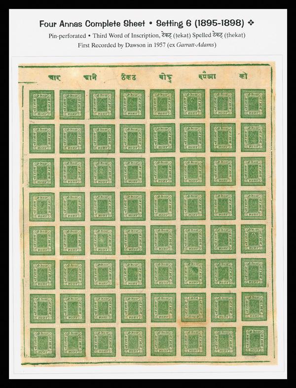 1895-98, Crown and Khukris, native wove paper, pin-perforated, 4a green, Setting 8 (Scott 9 Var.), complete sheet of 64, marginal inscription at top and frame lines all round, good color, one area of toning mostly affects position 54, without gum as issued, otherwise Fine. A rare multiple, ex Garratt-Adams. (Image)