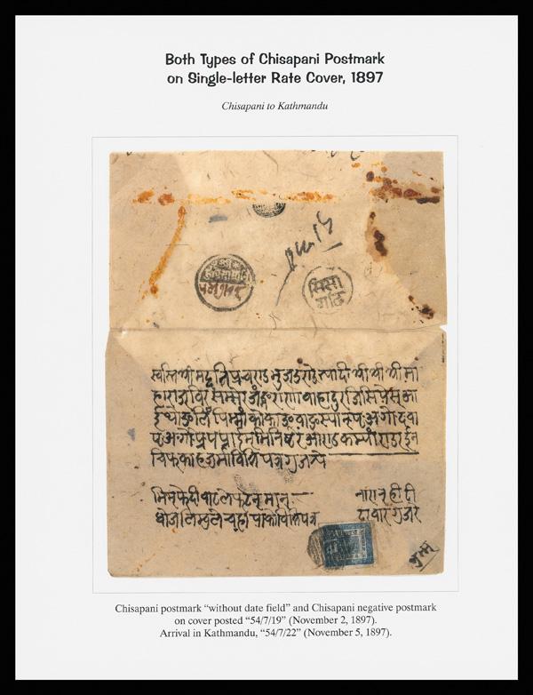 1897 (Nov. 2), Cover from Chisapani to Kathmandu (11.5), bearing 1a blue, large margins, canceled by "Chisapani" circular barred handstamp, showing "Chisapani" undated circular handstamp and "Chisapani" negative seal with date in manuscript adjacent, Fine to Very Fine. (Image)
