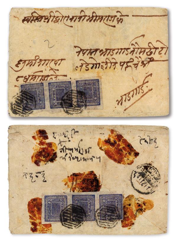 ca. 1903, Registered cover from Hanumannagar to Kathmandu, bearing on front and back recut frame 1a deep blue horizontal strips of three (2), canceled by Hanumannagar hexagonal handstamps, Very Fine. A marvelous Registered use, with 1978 R.P.S.L. certificate. (Image)