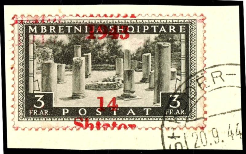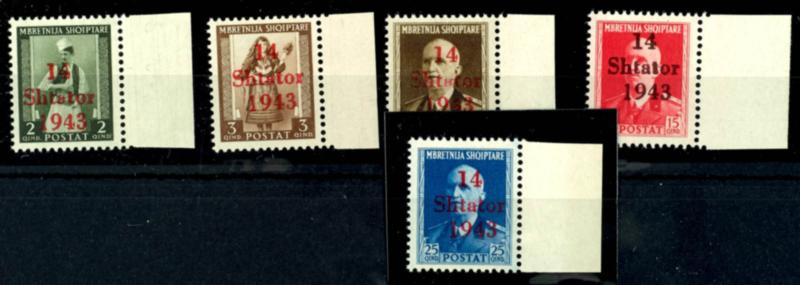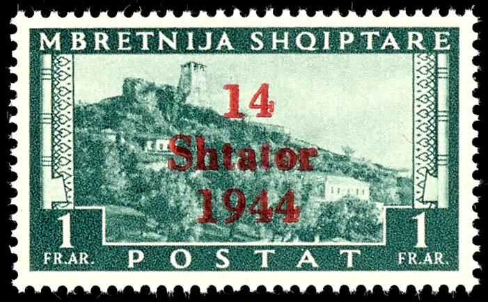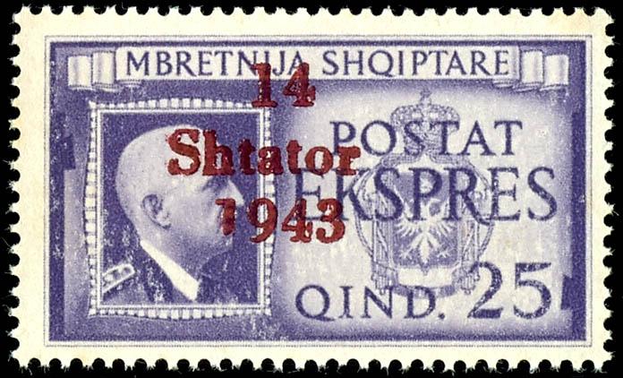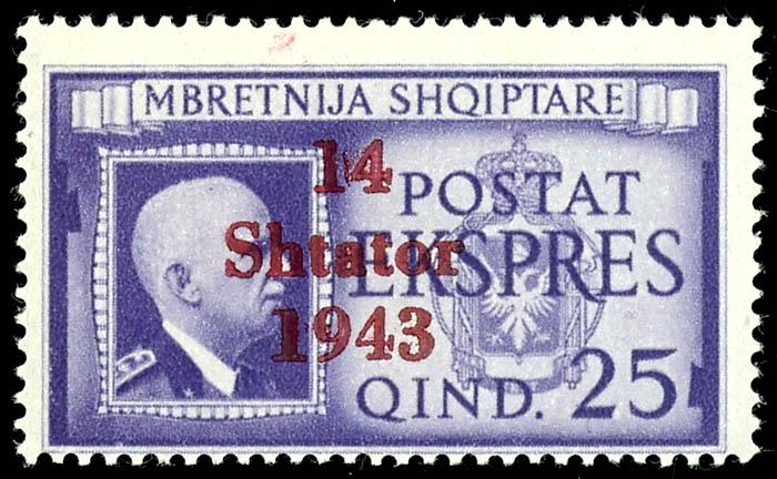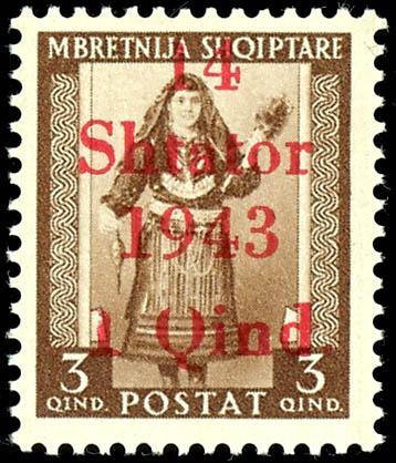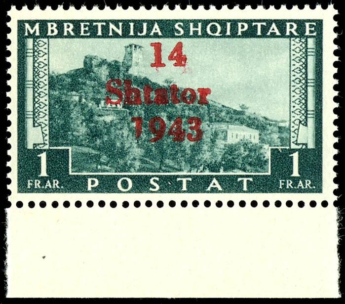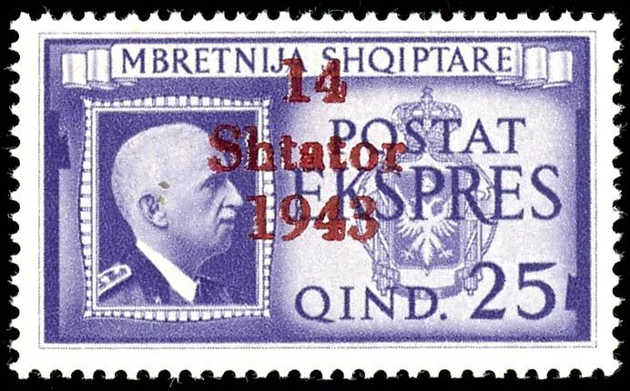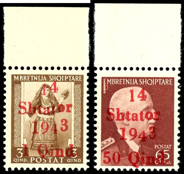 1 Qind to 3 Fr. regular stamps and 25 Qind express stamp with overprint \14 Shtator 1943\, complete set of 14 values, mint, flawless condition, partly signed, Michel 500.- (1/14) 1 Qind bis 3 Fr. Freimarken und 25 Qind Eilmarke mit Aufdruck \14 Shtator 1943\, kompletter Satz mit 14 Werten, postfrisch, tadellose Erhaltung, teils signiert, Mi. 500.- (Image)