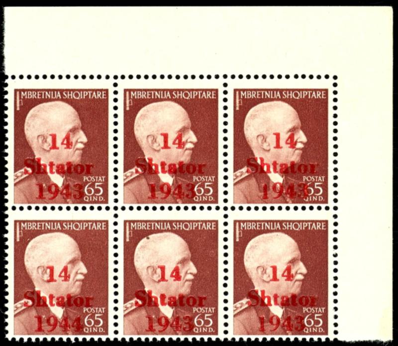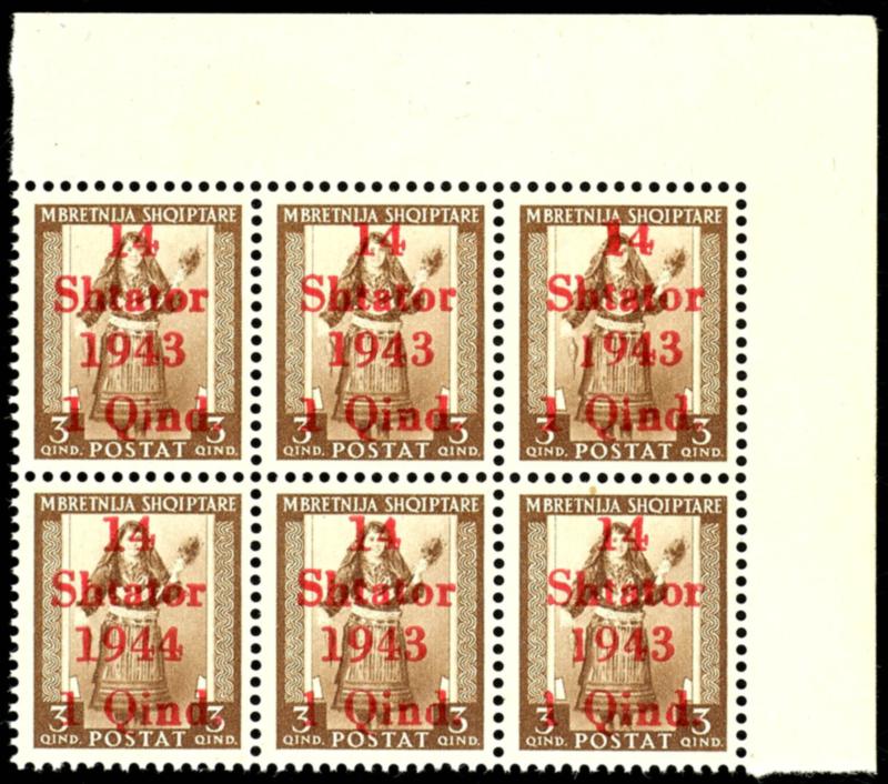 65 Qind stamp with overprint \14 Shtator 1943\, overprint error III \printing error 1944 instead of 1943\ (field 18), horizontal block of six from the corner margin, top right, mint never hinged, flawless condition, unsigned, photo certificate Robert Brunel BPP \The condition is flawless.\, Michel 450.- (10III,10(5)) Certificate 65 Qind Freimarke mit Aufdruck \14 Shtator 1943\, Aufdruckfehler III \Setzfehler 1944 statt 1943\ (Feld 18), waagerechter Sechserblock vom Eckrand oben rechts, postfrisch, tadellose Erhaltung, unsigniert, Fotoattest Robert Brunel BPP \Die Erhaltung ist einwandfrei.\, Mi. 450.- (Image)