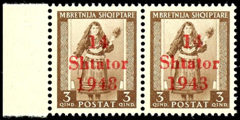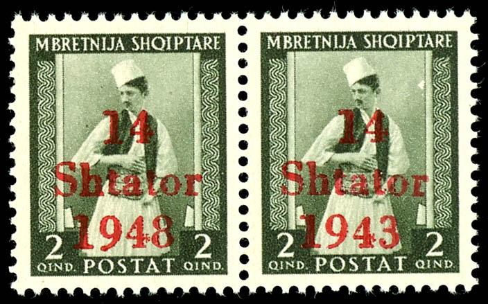 2 Qind stamp with overprint \14 Shtator 1943\, printing error I \misprint 1948 instead of 1943\ (field 51), horizontal pair with normal stamp, mint never hinged, flawless condition, unsigned, photo certificate Robert Brunel BPP \The condition is flawless.\, Michel 450.- (2I,2) Certificate 2 Qind Freimarke mit Aufdruck \14 Shtator 1943\, Aufdruckfehler I \Setzfehler 1948 statt 1943\ (Feld 51), waagerechtes Paar mit Normalmarke, postfrisch, tadellose Erhaltung, unsigniert, Fotoattest Robert Brunel BPP \Die Erhaltung ist einwandfrei.\, Mi. 450.- (Image)