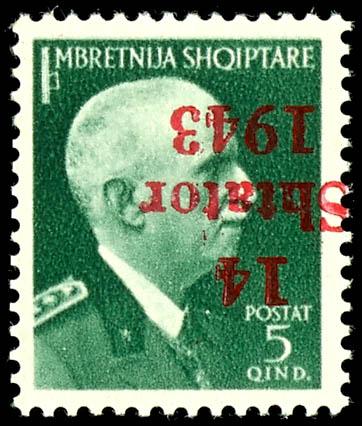 5 Qind stamp with overprint \14 Shtator 1943\, variety \inverted overprint\, mint, flawless condition, certified by Dr. Rommerskirchen BPP and photo certificate Robert Brunel VP \The condition is flawless.\, Michel 250.- (4K) Certificate 5 Qind Freimarke mit Aufdruck \14 Shtator 1943\, Abart \kopfstehender Aufdruck\, postfrisch, tadellose Erhaltung, geprüft Dr. Rommerskirchen BPP und Fotoattest Robert Brunel VP \Die Erhaltung ist einwandfrei.\, Mi. 250.- (Image)