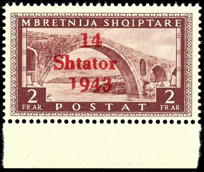 2 Qind, 3 Qind, 10 Qind, 15 Qind and 25 Qind postage stamps with the overprint \14 Shtator 1943\, uniformly from sheet block 80 with overprint variant \S in Shtator broken in the middle\, five values, mint never hinged, flawless condition, according to photographic findings Robert Brunel VP \The condition is impeccable.\, (see online catalog for images) ( 2/3,5/7) Certificate 2 Qind, 3 Qind, 10 Qind, 15 Qind und 25 Qind Freimarken mit Aufdruck \14 Shtator 1943\, einheitlich vom Bogenfeld 80 mit Aufdruckabart \S in Shtator in der Mitte gebrochen\, fünf Werte, postfrisch, tadellose Erhaltung, je Fotobefund Robert Brunel VP \Die Erhaltung ist einwandfrei.\, (Abbildungen siehe Onlinekatalog) (Image)