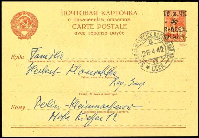 1 Rbl. on 10 Kopeks postcard, the value stamp on the postcard has a genuine overprint, tied with a stamp that was not authorized for postal use due to the Soviet state insignia and the designation CCCP, signed E Keiler and photo certificate Walter Zirath BPP \The card was certainly not sent by mail.\ (P1) Certificate 1 Rbl. auf 10 Kop. Ganzsachenkarte, der Wertstempel der Ganzsachenkarte hat einen echten Aufdruck, gefälligkeitsgestempelt mit einem Stempel der aufgrund der sowjetischen Staatsinsignien und der Bezeichnung CCCP nicht für den Postverkehr zugelassen war, signiert EKeiler und Fotoattest Walter Zirath BPP \Die Karte ist mit Sicherheit nicht postalisch befördert worden.\ (Image)