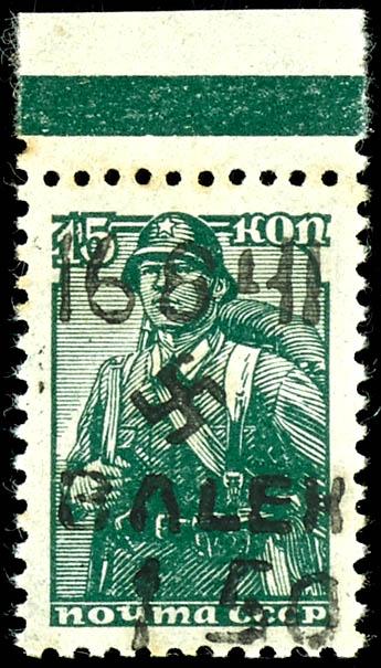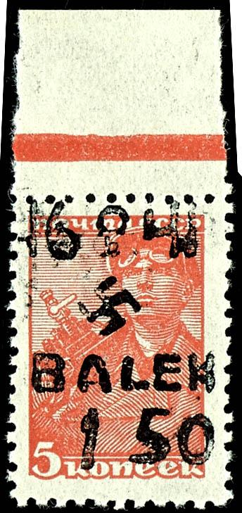 1, 50 Rbl. on 5 Kopek postage stamp, hand-stamped overprint in Type III (swastika 4 mm), top margin piece, mint never hinged, flawless condition, edition of only 15 copies, unsigned, photo certificate Walter Zirath BPP \The condition is impeccable... one of the greatest rarities of the German occupation issues during World War II\, Michel 30.000.- - rarely offered rarity! (3III) Certificate 1,50 Rbl. auf 5 Kopeken Freimarke, Handstempelaufdruck in Type III (Hakenkreuz 4 mm), Oberrandstück, postfrisch, tadellose Erhaltung, Auflage nur 15 Exemplare, unsigniert, Fotoattest Walter Zirath BPP \Die Erhaltung ist einwandfrei. ... zu den größten Seltenheiten der deutschen Besetzungsausgaben im II. Weltkrieg\, Mi. 30.000.- - selten angebotene Rarität! (Image)