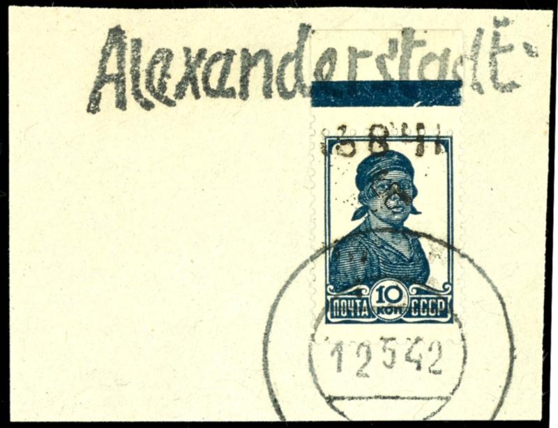 1, 50 Rbl on 10 Kopeks Workers, overprint in Type II (large swastika), stamp from the upper margin, postmarked with single-line \Alexanderstadt\ and silent postmark \12 5 42\ on a piece of mail, signed Krischke BPP and photo certificate Walter Zirath BPP (2025) \The condition is flawless.\, Michel 300.- (4II) 1,50 Rbl auf 10 Kopeken Werktätige, Aufdruck in Type II (großes Hakenkreuz), Marke vom Oberrand, gestempelt mit Einzeiler \Alexanderstadt\ und stummen Stempel \12 5 42\ auf Briefstück, signiert Krischke BPP und Fotoattest Walter Zirath BPP (2025) \Die Erhaltung ist einwandfrei.\, Mi. 300.- (Image)
