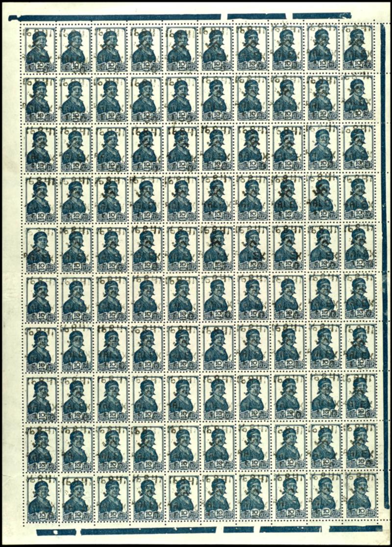 1, 50 Rbl. on 10 Kopeks Workers, overprint in Type II (swastika 6 mm), complete switch sheet of 100 stamps, mint never hinged, gum and hinge remnants only in the margin area, stamps perfectly preserved, complete sheets are extremely rare and hardly to be found! unsigned, Michel 20. 000.- (4II) 1,50 Rbl. auf 10 Kopeken Werktätige, Aufdruck in Type II (Hakenkreuz 6 mm), kompletter Schalterbogen zu 100 Marken, postfrisch, Haftstellen und Falze nur im Randbereich, Marken tadellos erhalten, komplette Bögen sind äußerst selten und kaum mehr zu finden!, unsigniert, Mi. 20.000.- (Image)
