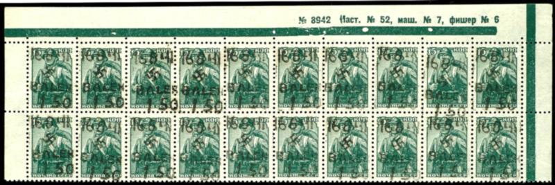 1, 50 Rbl. on 15 Kopek postage stamp, hand-stamped overprint in Type III (swastika 6 mm), part of a sheet of 20 values (fields 1-10 or 11-20 of the original stamp sheet), mint never hinged, flawless, each stamp certified by Zirath BPP, Michel 2. 000.- without surcharge for the rare multiple. (5III(20)) 1,50 Rbl. auf 15 Kopeken Freimarke, Handstempelaufdruck in Type III (Hakenkreuz 6 mm), Bogenteil zu 20 Werten (Felder 1-10 bzw. 11-20 des Urmarkenbogens), postfrisch, tadellos, jede Marke geprüft Zirath BPP, Mi. 2.000.- ohne Aufschlag für die seltene Einheit (Image)