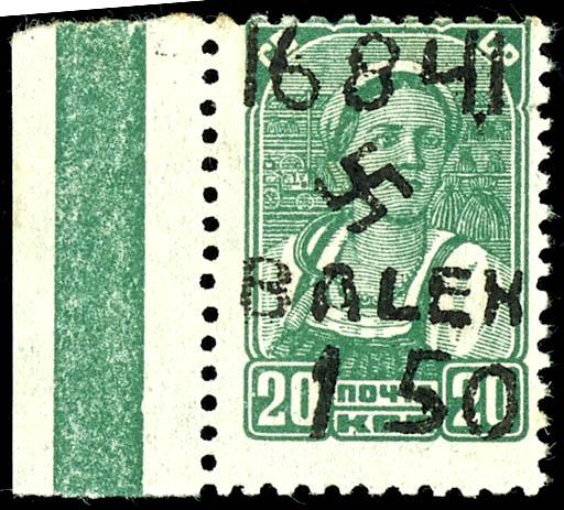 1, 50 Rbl. on 20 Kopek postage stamp, hand-stamped overprint in Type II (swastika 6 mm), mint never hinged, flawless condition, rare stamp, signed Pickenpack et alia and photo certificate Walter Zirath BPP \The condition of the stamp is flawless.\, Michel 2.000.- (undervalued) (6II) Certificate 1,50 Rbl. auf 20 Kopeken Freimarke, Handstempelaufdruck in Type II (Hakenkreuz 6 mm), postfrisch, tadellose Erhaltung, seltene Marke, signiert Pickenpack et alia und Fotoattest Walter Zirath BPP \Die Erhaltung der Marke ist einwandfrei.\, Mi. 2.000.- (unterbewertet) (Image)