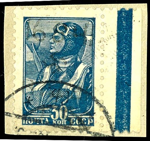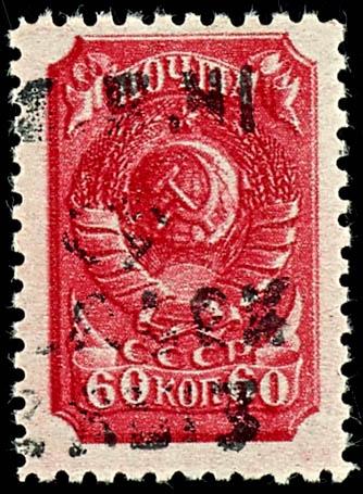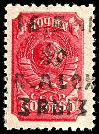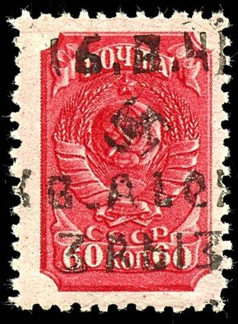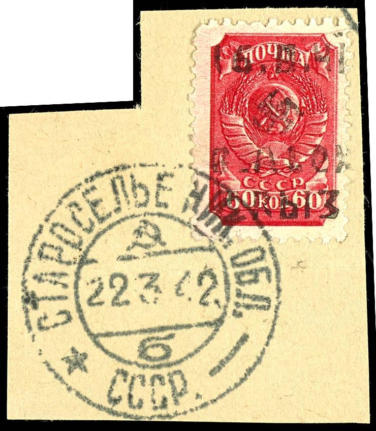 3 Ruble on 60 Kopeks postage stamp, overprint in Type III, obliterated with a Cyrillic postmark \STAROSELA 22 3 42\ on a postal fragment; the postmark was not officially allowed due to the Soviet state insignia; the stamp is slightly ovalled at the upper left corner; photo certificate Gerhard Krischke BPP. (11III) Certificate 3 Rubel auf 60 Kop. Freimarke, Aufdruck in Type III, gefälligkeitsentwertet mit kyrillischem Stempel \STAROSELA 22 3 42\ auf Briefstück, postalisch war der Stempel nicht zugelassen wegen der sowjetischen Staatsinsignien, Marke oben links eckrund, Fotoattest Gerhard Krischke BPP (Image)