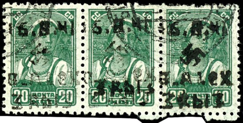 3 R on 20 Kopeks, black-yellow-green, overprint in Type III (swastika 4 mm), horizontal strip of three! postmarked with a Cyrillic stamp, the perforations are slightly shortened in the upper row for two stamps, otherwise the condition is flawless, units of this stamp are extremely rare, signed Pickenpack et alia, photo certificates Werner Pickenpack BPP (1971): \ This is the only strip of three of number 2 that I know of so far. \ and Walter Zirath BPP (2025) \The strip of three is very rare.\, Michel 5. 400.- (9III) Certificate 3 R auf 20 Kop. Werktätige schwarzgelbgrün, Aufdruck in Type III (Hakenkreuz 4mm), waagerechter Dreierstreifen!, entwertet mit kyrillischem Stempel, in der oberen Zähnung bei zwei Marken leicht verkürzte Zähne, die sonstige Erhaltung ist tadellos, Einheiten dieser Marke sind äußerst selten, signiert Pickenpack et alia, Fotoatteste Werner Pickenpack BPP (1971):\ Es handelt sich um den bisher einzigen mir bekannten 3er Streifen der Nr.9.\ und Walter Zirath BPP (2025) \Der Dreierstreifen ist sehr selten.\, Mi. 5.400.- (Image)