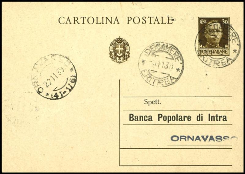 1939, annexation Italy, 30 C letter card from Italy without overprint, from DECAMERE ERITREA to Ornavasso in Italy with arrival postmark, commercially usage. 1939, Annexion Italiens, 30 C Briefkarte aus Italien ohne Aufdruck, von DECAMERE ERITREA nach Ornavasso in Italien mit Ankunftsstempel, Bedarfsverwendung. (Image)