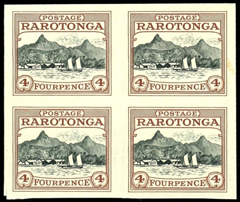 4 P port and Berg Ikurangi, proof print in more issued colour, block of four, slightly spotted (SG84Proofs (4)) 4 P Hafen und Berg Ikurangi, Probedruck in ausgegebener Farbe, Viererblock, leicht fleckig (Image)