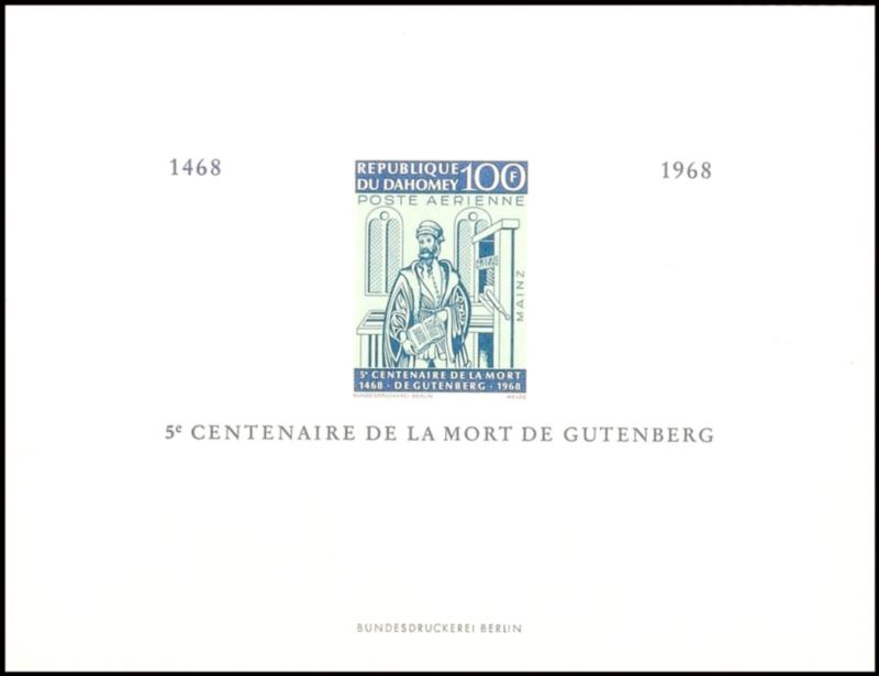 45 F, 100 F. as well 45 F. plus 100 F. \Gutenberg\ in terms of 3 Secretary of State souvenir sheets, printed in the Federal Printing Office Berlin (Bl.13) 45 F., 100 F. sowie 45 F. + 100 F. \Gutenberg\ in Form von 3 Ministerblocks, gedruckt in der Bundesdruckerei Berlin (Image)