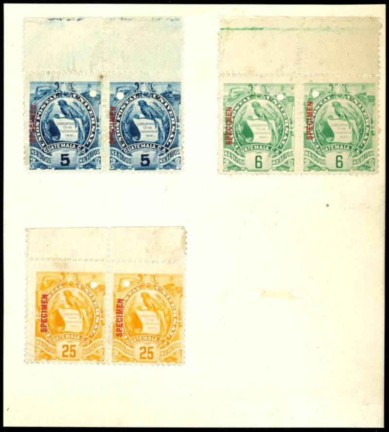 coat of arms, proofs / templates of all 7 nominal value of 1 C to 25 C in each case upper margin pairs in more final mount and colouration with official cancel punching and red respectively blue site imprint SPECIMEN, on box mounted, very rare, first 1990 appeared the archive holdings of the printing plant (96/100,103(2)) Wappen, Probeabzüge/Vorlagen aller 7 Nennwerte von 1 C bis 25 C jeweils Oberrandpaare in endgültiger Fassung und Kolorierung mit amtlicher Stempelstanzung und rotem bzw. blauem Seitenaufdruck SPECIMEN, auf Karton montiert, sehr selten, erst 1990 erschienen die Archivbestände der Druckerei (Image)