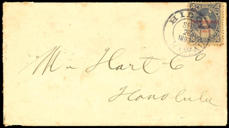 HILO / HAWAII, clear violet town cancel on cover with 2 C. violet from 28.9.1893 to Honolulu, stamp at the top stuck a little bit over the edge and perforation slightly spotted, reverse arrival postmark (43) HILO /HAWAII, klarer violetter Ortsstempel auf Brief mit 2 C. violett vom 28.9.1893 nach Honolulu, Marke oben etwas über den Rand geklebt und Zähnung leicht fleckig, rs. Ankunftsstempel (Image)