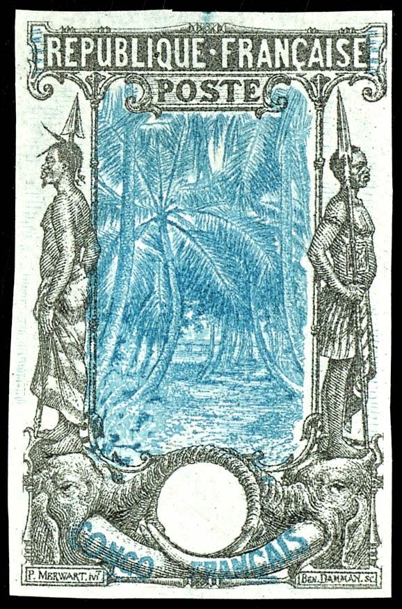 1900, essay, Coconut Groove design for height nominal value, medium sized, imperforated essay on paper, frame 31 x 49 mm, blue / grey (Essay) 1900, Essay, Coconut Groove-Design für hohe Nennwerte, mittelgroßer, ungezähnter Aufsatz auf Papier, Rahmen 31 x 49 mm, blau/grau (Image)