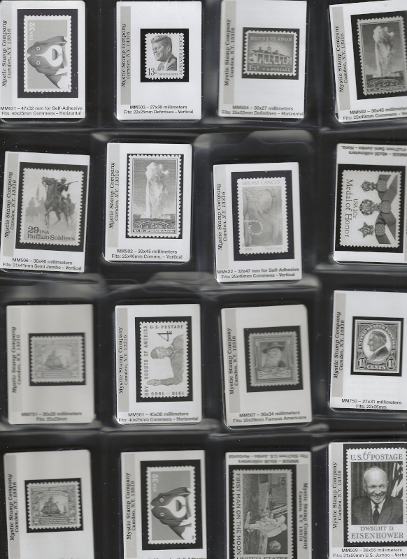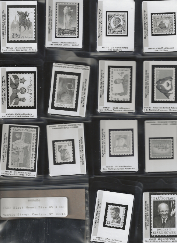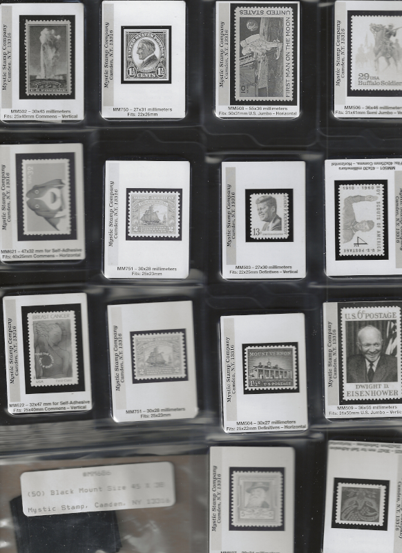 MOUNTS, 57 Full Packs of "Mystic" Dark Background Mounts (50 Mounts per Pack), All are Pre-Cut Sizes (for United States Stamps), Good Variety, New, VF Cond., Mystic Retail Price is $242.00 (Image)