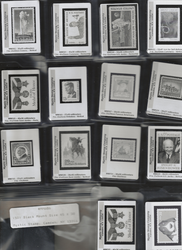 MOUNTS, 70 Full Packs of "Mystic" Dark Background Mounts (50 Mounts per Pack), All are Pre-Cut Sizes (for United States Stamps), Good Variety, New, VF Cond., Mystic Retail Price is $297.00 (Image)
