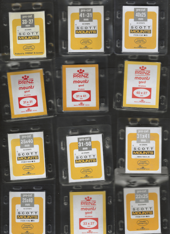 MOUNTS, 55 Packs of "Scott/Prinz" Brand (Dark Background), Pre-Cut Mounts for U.S. Stamps, Opened and Unopened, Equal to About 46 Full Packs, Many Diff. Sizes, VF Cond., Retail Value is About $180.00 (1.5 lbs.) (Image)