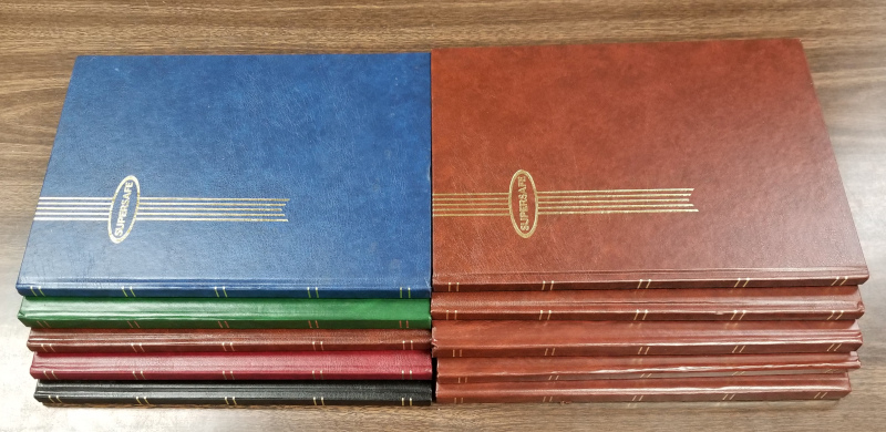 STOCK BOOKS, Ten "Supersafe" Brand Stock Books (W4/8), Each is 12 in. x 9 in., 8 Leaves (16 Pages), White Background, Each Page with 10 Rows, 6 Books with Brown Cover, Plus One Each in Green, Black, Blue, & Red, Like New Cond., Clean, VF, Retail Price is About $300.00 (14. lbs.) (Image)