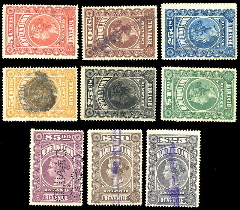 NFR1-NFR9: 1898 Victoria, 5¢ to $25, used, 75¢ with strong offset, $1 appears mint og, f-vf (Image)