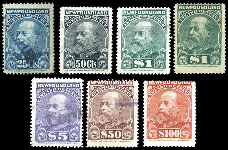 NFR10-NFR15,NFR12b: 1907 Edward VII 25¢ to $100, $100 with strong offset, plus $1 on very thick paper, used. (Image)