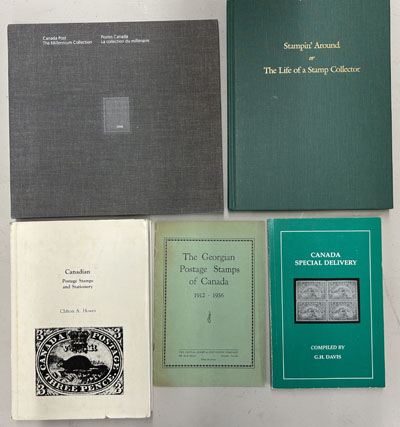 Group of 15 Books on Canadian Stamps, etc. Stampin' Around or The Life of a Stamp Collector (Jarrett, Scrimgeour), Canada Special Delivery (Davis), an Annual Collection for the Millennium, a rare The Georgian Postage Stamps of Canada 1912-1936 (Capital Stamp & Stationery Co.), Canadian Postage Stamps and Stationery (Howes1974 reprint), Webb's Postal Stationery Catalogue (6th ed.), Canadian Revenue Stamp Catalogue (van Dam, 31st ed.), Canadian Stamps with Perforated Initials (Tomasson), a Sparks Auctions name sale catalogue for part 2 of The Outaouais Collection, and 6 others, see photos. (Image)